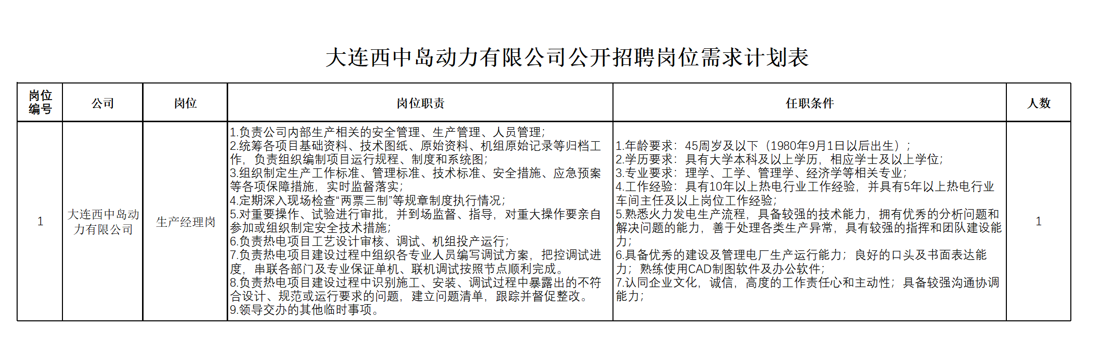 1.大连西中岛动力服务有限公司公开招聘岗位需求计划表